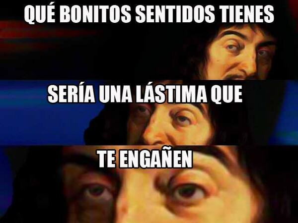 Cogiendo 132 gramos de carbono, 15 gramos de hidrógeno, 14 gramos de nitrógeno y 32 gramos de oxígeno, salía el 3,4-metilendioximentafetamina, a lo que resumía la nueva droga a MDMA, ya que este tipo de conocimiento no se conocían para humanos. Descartes quedó anonadado y sin saber que decir a ello. Esto a Descartes le dió mucho que pensar. Descartes empezó a dudar de todo, de la realidad, de que los sentidos nos engañan, de que teníamos dentro de nosotros un dios engañador en la cabeza (eso se utilizó como un ejemplo, pero no tenemos un ser engañador ahí tolokoh en la cabeza) no sabía si existía cuando iba borracho o no. Nada existía para él, no podía demostrarlo racionalmente. Pensó y pensó y le vino la iluminación divina. Se metió un par de mentanfetaminas y en plan yonki lo sacó "Pienso, luego existo".